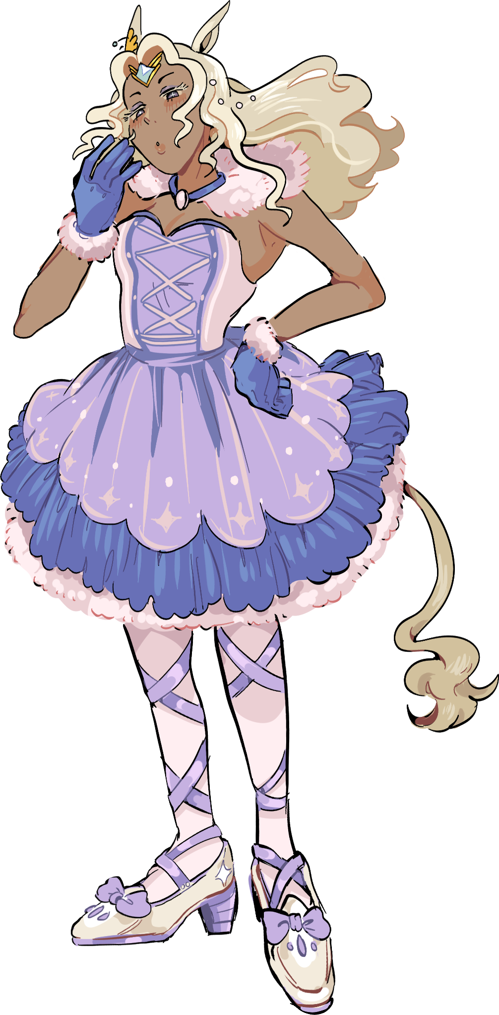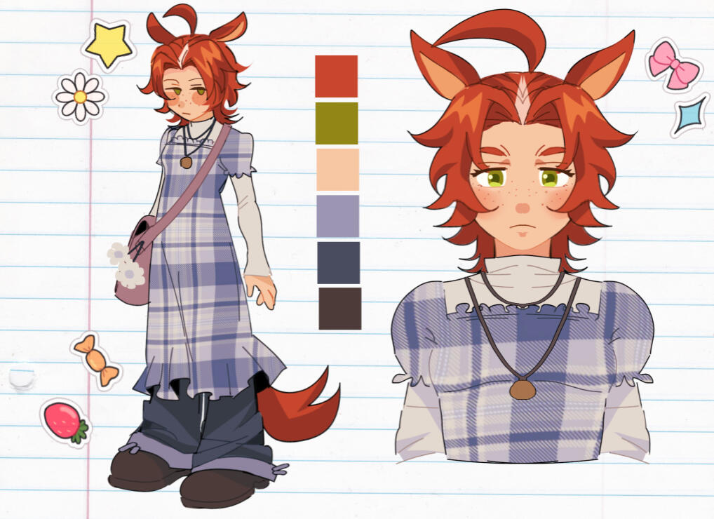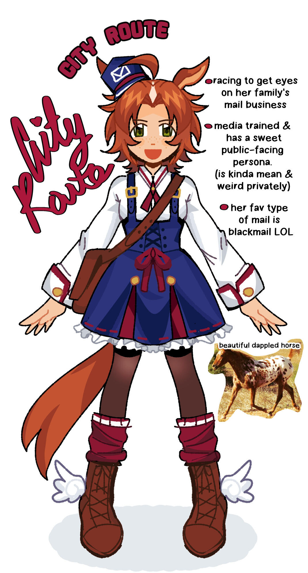 Rue grew up in a small town as one of many daughters in the City family, all of which work for the family's not too well known mail courier business. She does everything that is expected of her and more, yet she still is unable to stand out enough to turn any heads her way. She may pretend to turn her nose up at extra work, but she truly enjoys being depended on and having some sort of task to work through.After years of wearing hand-me-downs and having her name confused for her sisters', she found herself desperately longing to be a unique, recognizable Umamusume who is lauded and sought after.Her desire for attention and praise from other people eventually leads her to scraping together funds from her paychecks to send herself to Tracen Academy. She says it's to help get eyes on her family's business, but she has her own hidden ambitions in mind. But even as her name becomes more well known and she achieves the recognition she has always coveted, she still feels as though something is missing...