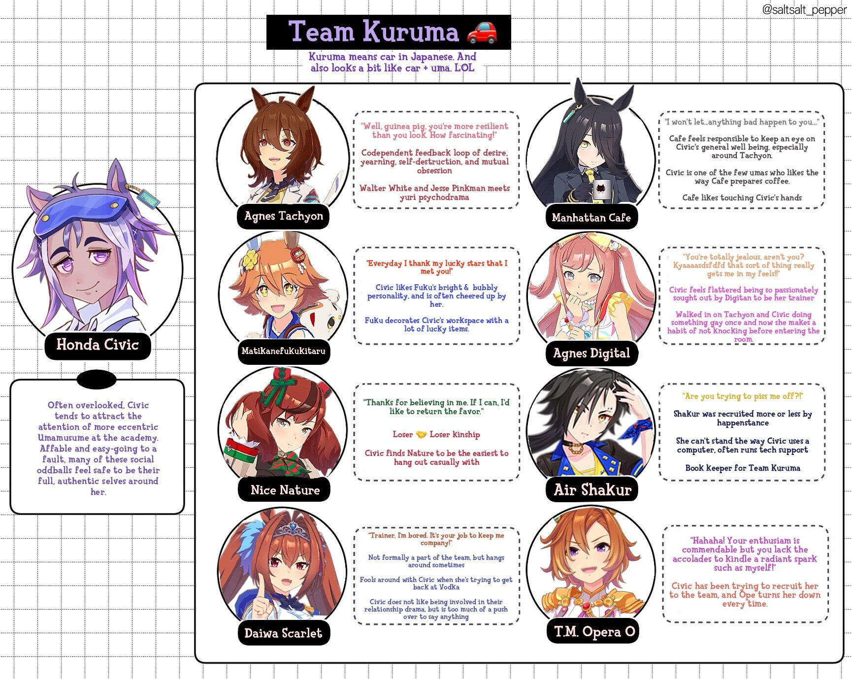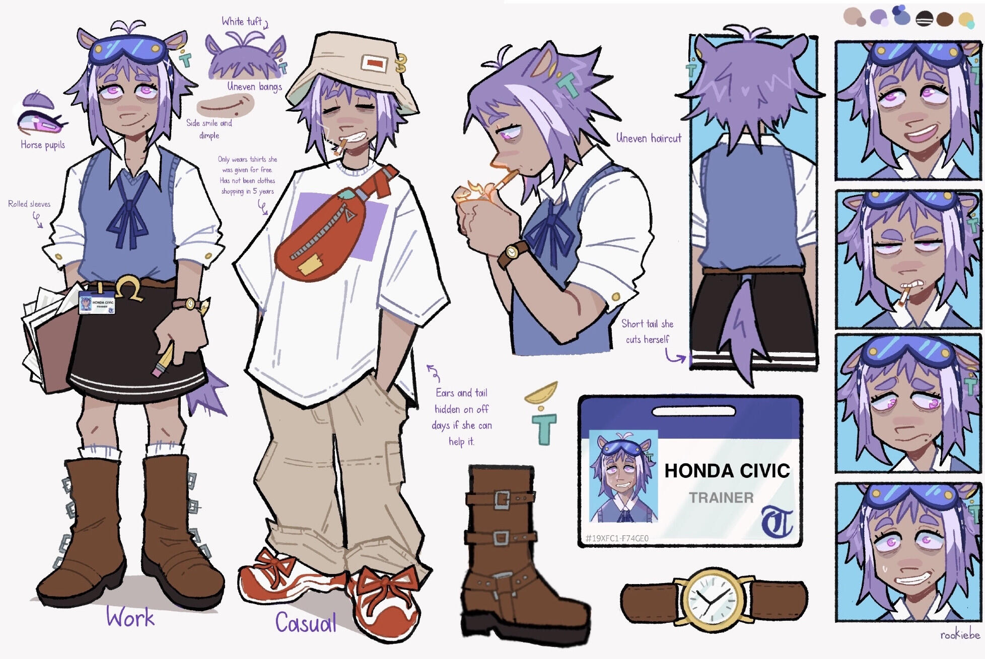 Honda Civic is an overworked salary-man in the body of an Umamusume. She has no desire to run at all, instead opting to help others reach their potential from the sidelines as a trainer.As a chronic people-pleaser, Civic believes that if she’s meant to be a tool, she may as well be a useful one. She’s attuned to everyone’s needs but her own, having spent a lifetime prioritizing others before herself.Her affable, easy-going nature often attracts the attention of the more eccentric Umamusume at the academy, many of whom feel comfortable to be authentically themselves around her.